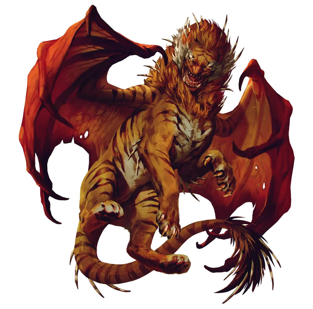 Мантикора — чудовищная помесь льва, дракона и человека, из всей еды предпочитающая именно человечину. Длинный хвост мантикор покрыт колючками, как у дикобраза, и чудовище, взмахнув хвостом как пращой, может запустить их в противника. Поднявшись на недосягаемую для противника высоту, мантикора может обстреливать его смертоносными шипами, поэтому даже хорошо вооружённый воин в сражении с ней рискует жизнью.