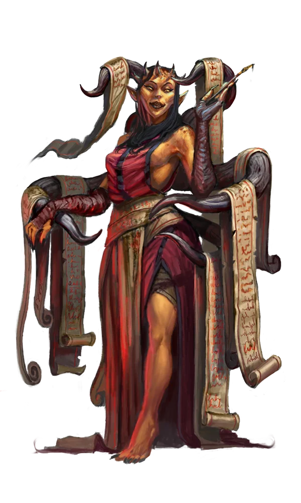 В ближнем бою binding contract +23 [+19/+15] ( быстрое, разоружающее, зло, магический, длинное 10 футов, сбивающее), Урон 3d6+11 режущий, 1d6 зло, хватка, и жуткая рана В ближнем бою рог +21 [+16/+11] ( магический), Урон 3d10+11 колющий и жуткая рана Врождённые сакральные заклинания СЛ 31; 10й тайновидение (неограниченно, see infernal investment); 7й планарный переход; 5й дверь в пространстве, огненный шар, иллюзорная сцена, удар молнии, указатель (неограниченно), зондирование памяти, послание (неограниченно); 4й дверь в пространстве (неограниченно), личное убежище, тишина; 3й чтение мыслей (неограниченно); Фокусы (7й) обнаружение магии; Постоянные (5й) полиглот